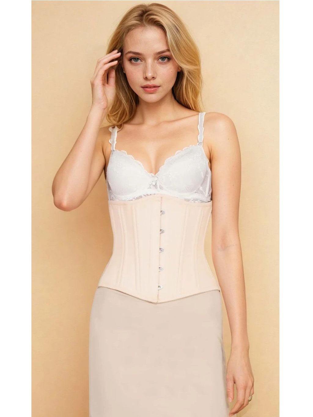 Korzet - Extra stahovací korzet pod prsa na běžné nošení v béžové barvě z bavlny (běžná délka, zdvojené ocelové kostice, bavlněná podšívka)