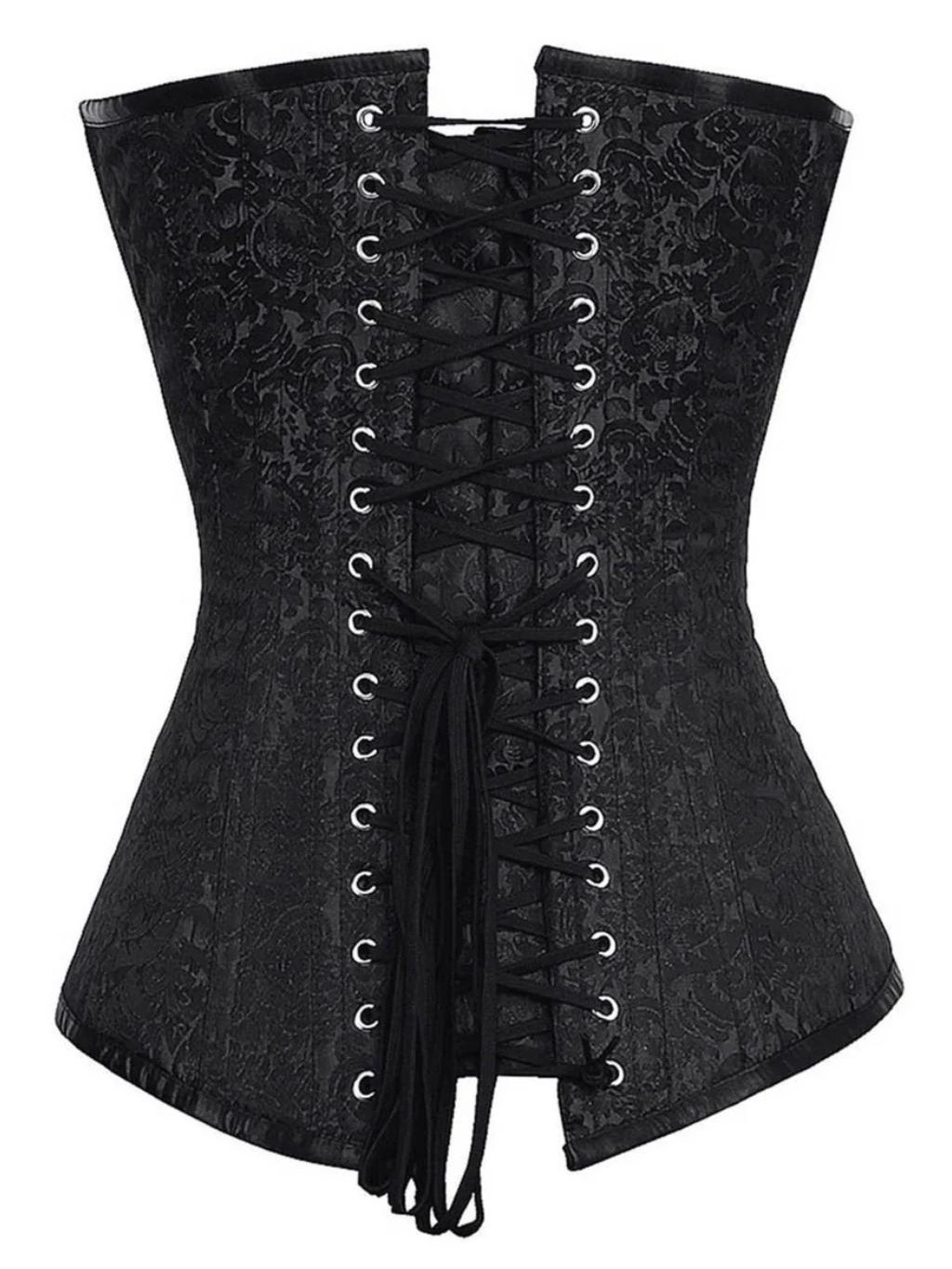 Korzet - Stahovací korzet přes poprsí v prodloužené délce na společenské události z černého brokátu (košíčky C-D, prodloužená délka, ocelové kostice, bavlněná podšívka)